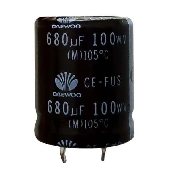 شرکت دوو الکترونیکس در کره جنوبی در سال 1971 تاسیس شده و در زمینه تولید قطعات اکترونیک و لوازم خانگی و… فعالیت دارد . خازنها در بردهای الکترونیکی و یا درمدارات برق صنعتی برای ذخیره بار الکتریکی به کار می روند. خازنهای الکترولیت از نوعی دی الکتریک جنس کاغذ آغشته به یک الکترولیت مشخص با غلظت و نوع مشخص می باشد که میزان خاصیت دی الکتریک را با پارامترهای مربوط به ماده شیمیایی یا همان الکترولیت می توان تعیین کرد و با این روش ظرفیت و ولتاژ شکست را در خازن ها ، با سطح یکسان دو صفحه خازن و یا در واقع حجم و اندازه مشخص خازن ، به میزان مورد نیاز تغییر داد.خازنهای الکترولیت را می توان با ظرفیت های بالاتر از انواع دیگر خازنها ، طراحی و تولید کرد. خازنهای الکترولیت علاوه بر ظرفیت و ولتاژ شکست که مقدار نهایی ولتاژ اعمال شونده به خازن بدون آسیب دیدن آن می باشد ، از فاکتور سومی با عنوان بیشینه دمای قابل تحمل ، نیز برخوردارند. ظرفیت این خازن 680 میکروفاراد و ولتاژ شکست آن 100 ولت بوده و بیشینه دمای کاری آن 105 درجه سانتیگراد می باشد .