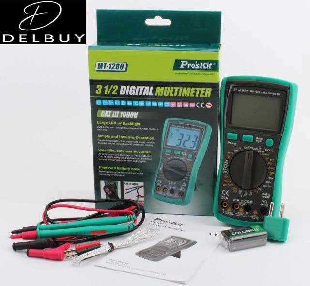 مولتی متر دیجیتال MT-1280 از شرکت پروسکیت است. این مولتی متر سلکتوری بوده و دارای امکاناتی چون دماسنج ، خازن سنج ، ولت متر ، اهم متر و آمپر متر است. همچنین این مولتی متر دارای نور صفحه نمایش می باشد. همراه این دستگاه پراب مولتی متر ، پراب دماسنج و تبدیل برای تست قطعات مستقیم روی دستگاه وجود دارد.