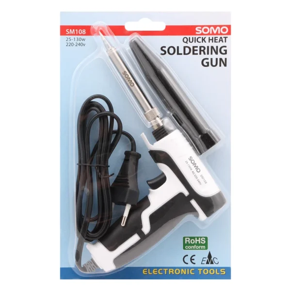 ضمنا هویهها به دو صورت معمولی یا تفنگی ساخته میشوند. به خاطر داشته باشید که اگر به رشتهی برق و الکترونیک علاقه دارید و مایل هستید تا با مدارهای الکتریکی و الکترونیکی کار کنید، دستگاه هویه ازجملهی ابزارهایی است که بهدفعات مورداستفاده شما قرار میگیرد. شرکت «سومو»(Somo) دستگاههای هویهی متعدد و متنوعی را تولید کرده که مدل SM-108ازجملهی محصولات سومو محسوب میشود که یک هویهی تفنگی است. این دستگاه، با برق شهری و با توانی متغیر بین 25 تا 130 وات کار میکند و با کیفیت قابلقبولی تولید میشود. بدنه دستگاه از جنس پلاستیک ساخته میشود. یک چراغ برای نمایش وضعیت هویه در پشت دستهی محصول قرار دارد.