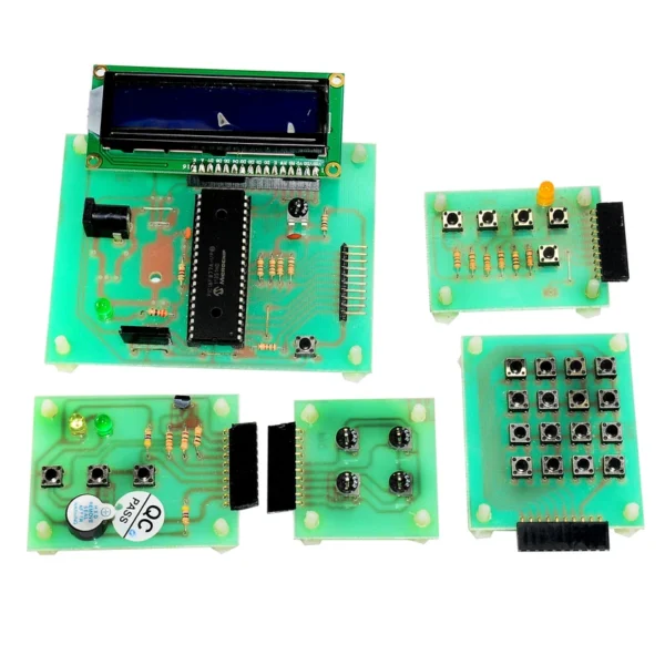 در این محصول با استفاده از حداقل قطعات،چندین پروژه عملی با استفاده از میکروکنترلر ارائه شده است. این پروژه ها دارای کاربردهای عملی وآموزشی بسیار گسترده می باشند. این مدار به صورت پنج برد مدار چاپی جداگانه طراحی گردیده که یکی از آنها (برد بزرگتر) برد اصلی می باشدو چهار برد دیگر متناسب با هریک از پروژه ها به برد اصلی متصل می شوند.
